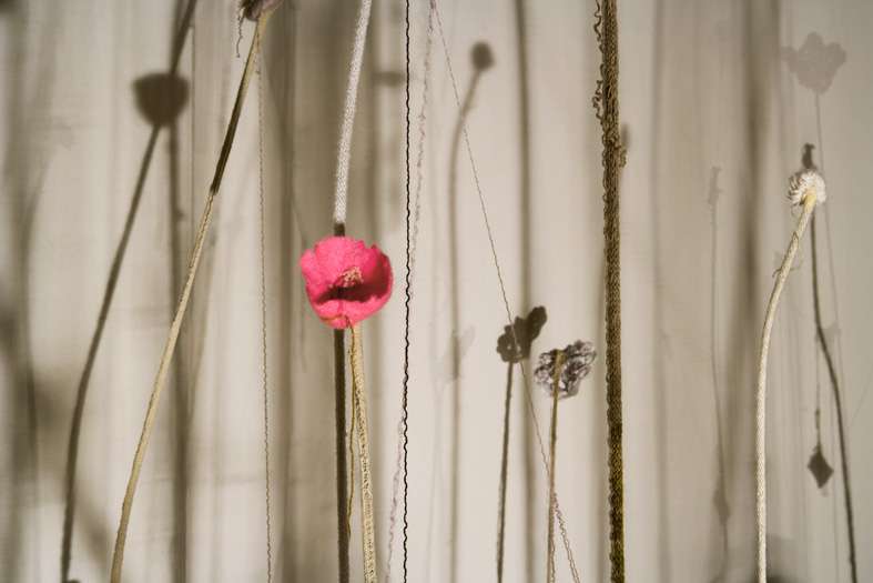 Kari Steihaug's objects often have threads of wool hanging from them. These threads remind us about the perspective of time and point to the object's origin. The wool threads also act as an extra filter between the observer and the surroundings, and this can be regarded as an additional demonstration of time. In the installation Remnants, the passing of time is partly hidden from us and it is up to us to try to grasp the span of time that has elapsed in Steihaug's studio while she unravelled her objets trouvés, or castoffs, as she calls them. She diligently shapes each petal, joins them together to make a flower and knits the stem that is twined around each steel wire. With her installation, Steihaug aims to arouse emotion, wonder and reflection in the observer. She focuses on beauty too, by creating delicately coloured and finished objects that evoke an atmosphere of something unexpected and mysterious. The colour scheme is mainly earthy tones, broken up here and there with a few strong colours. Her own statements about the purpose of her various installations are revealing: